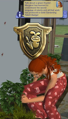 So what happened last round? Both of the Caleinte cats passed away, and the dog Maxx was brought in. It was thought that perhaps 6 pet TOC could occur before Dina's Grim party, but it doesn't look like that is going to happen. Debbie secured a job in business, putting her on the path toward perm plat status. Maggie constantly wished to date boys, having racked up 4 (that I could find in the blog entry) dates with new boys she didn't know. She found them by wishing for them out of the well. There might have been more. She also gained membership at My Muse and Aspirational Science, and gained a silver badge in gardening. On Saturday Debbie and George got married and Debbie got pregnant right away. Funny that she never got pregnant with all the woohoo-ing before she and George married. A vacation home was purchased which will be visited at a later time. Russ Bear the burglar paid a visit, but was caught before he could steal anything.