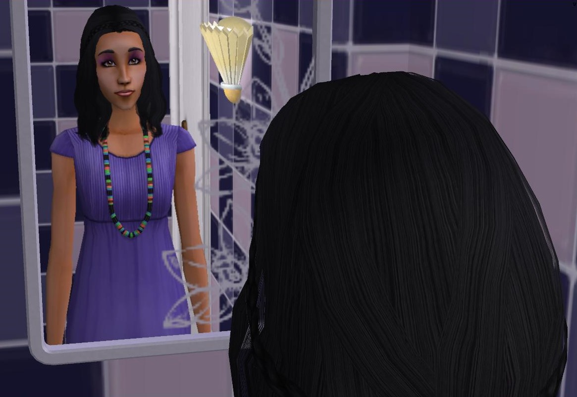 Being an especially mean Sim, Isabel requires an immense amount of time to get her mood high enough to do homework. Some evenings she misses doing her homework because of it. Here her dad helps her get caught up.